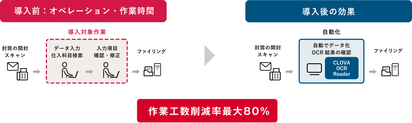 CLOVA OCRを活用する事で、請求書業務における入力レス・ペーパーレスを推進し、全体の作業時間を削減する事ができます。